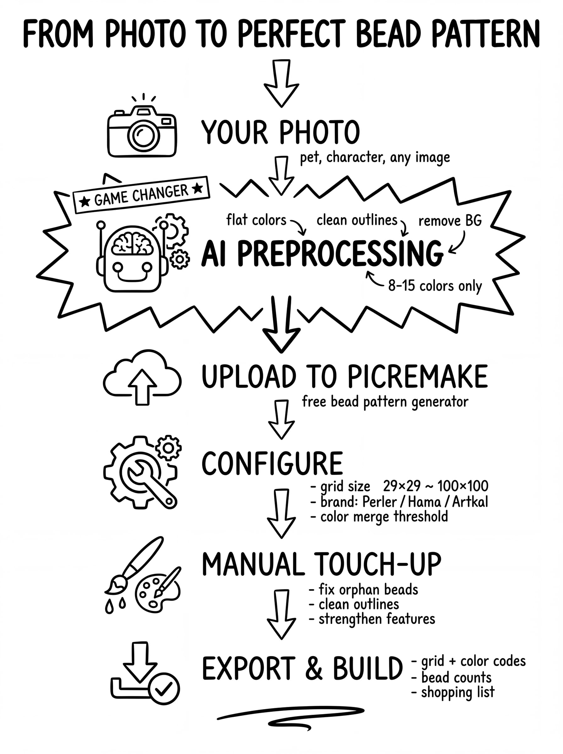 Professional bead artists and Etsy sellers who produce consistently clean, recognizable patterns share a common workflow: they preprocess their source images using AI to create bead-optimized versions before feeding them into a pattern generator. This preprocessing step transforms a complex photograph into an image that is inherently designed to survive aggressive downscaling and color quantization.